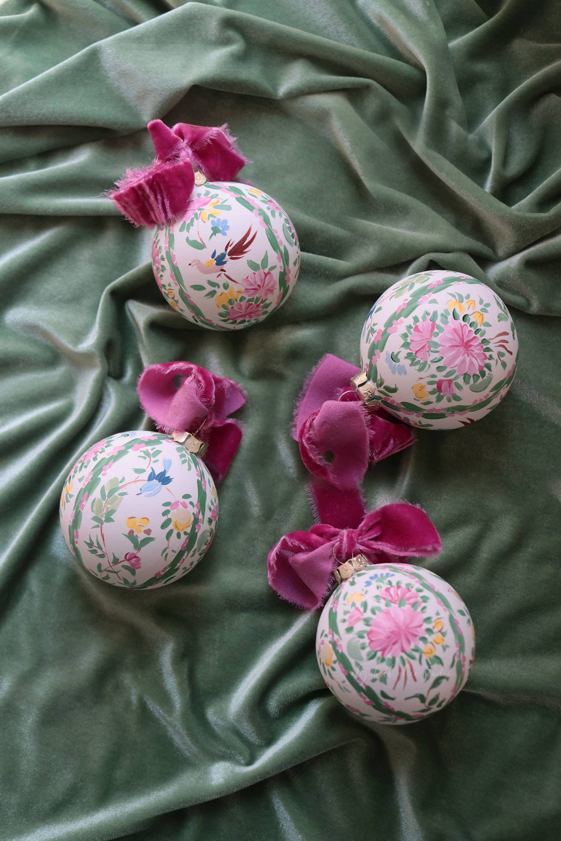 Inspired by antique china patterns, Elizabeth Alice Studio's signature chinoiserie paintings are perfect for adorning your Christmas tree! Flowers and birds are scattered across the large 3" ceramic base, then finished with a hand-dyed fuchsia velvet raw-edge ribbon. Incredibly special!